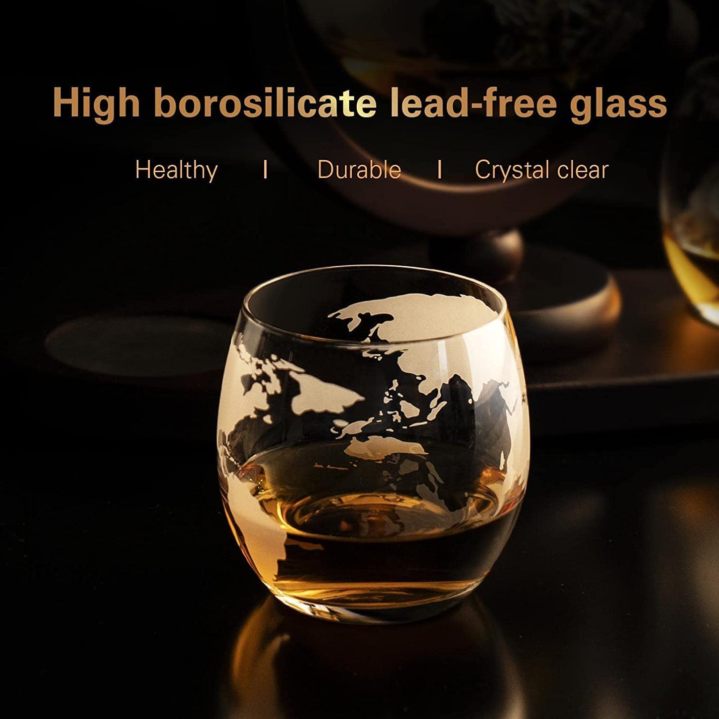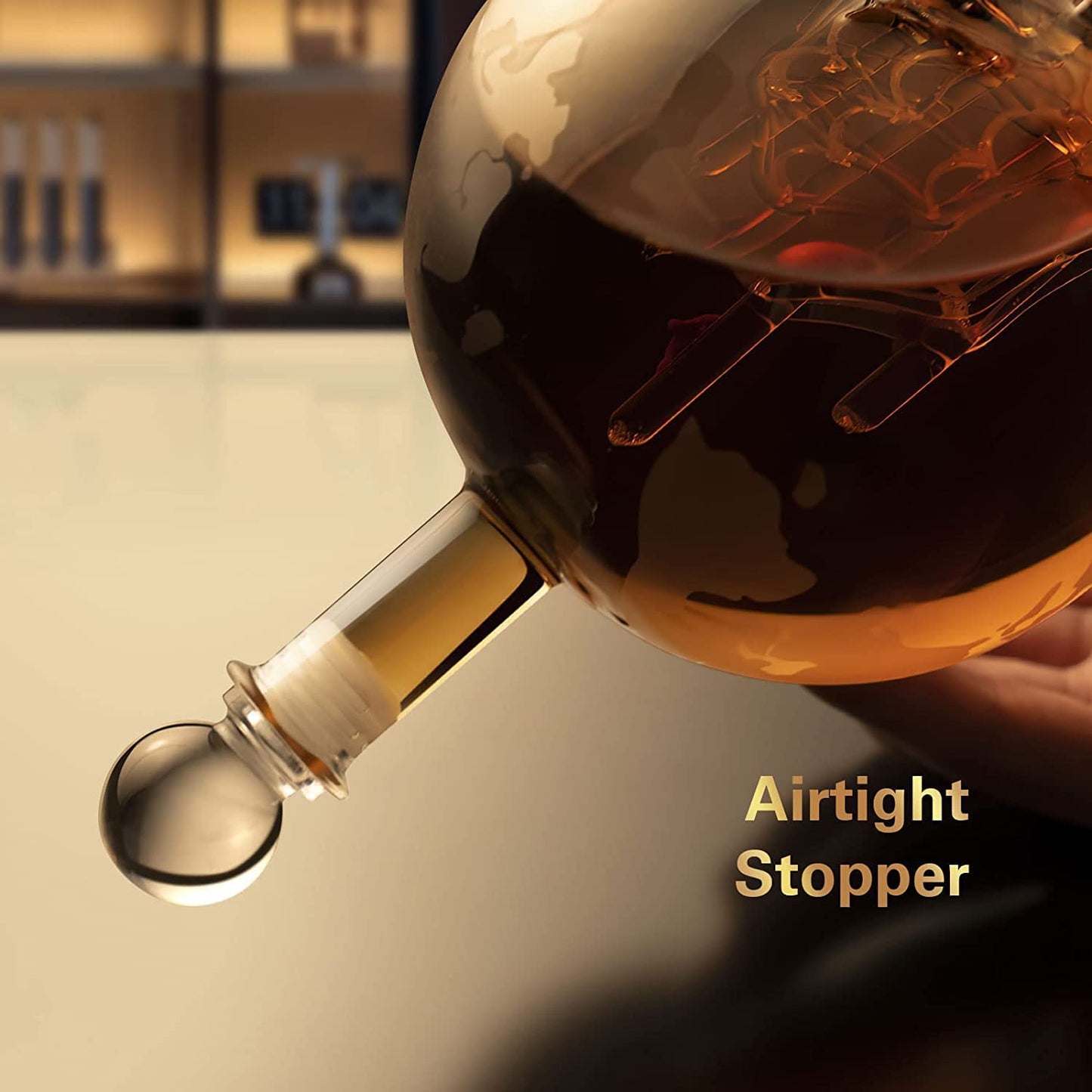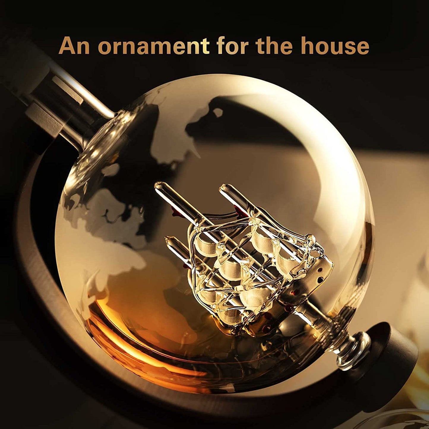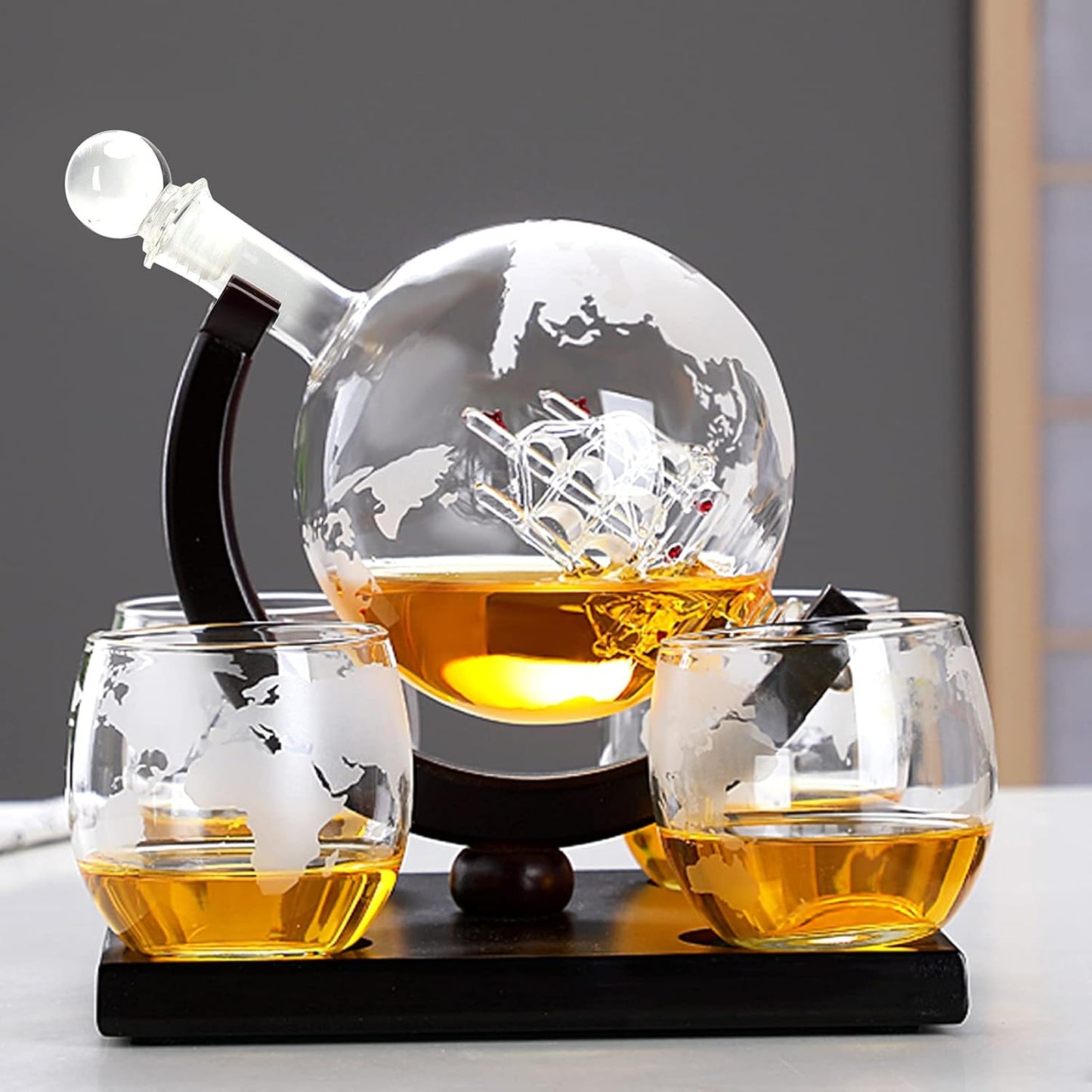 Transform your bar setup with this exquisite World Map Globe Decanter Set, featuring a round decanter with a detailed ship model inside. Designed for whiskey, wine, or any of your favorite spirits, this decanter boasts a beautifully etched world map, perfectly complemented by four matching glasses etched with the same design.