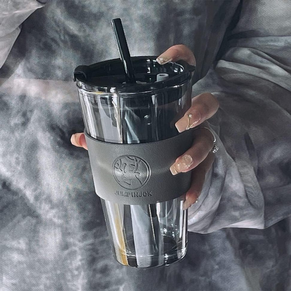 Leather Sleeve Glass Tumbler with Straw & Lid for Hot/Cold Drinks