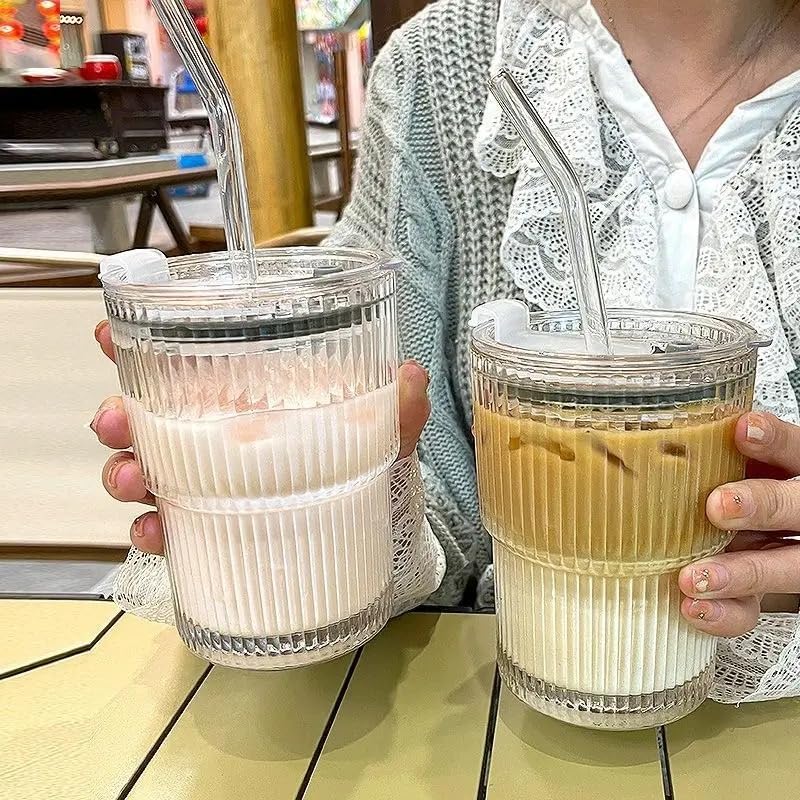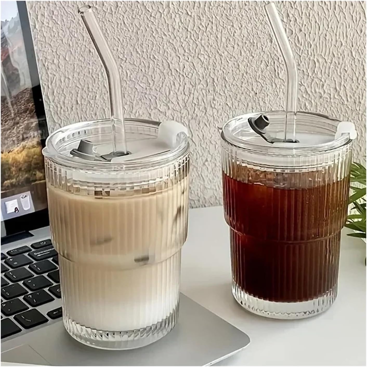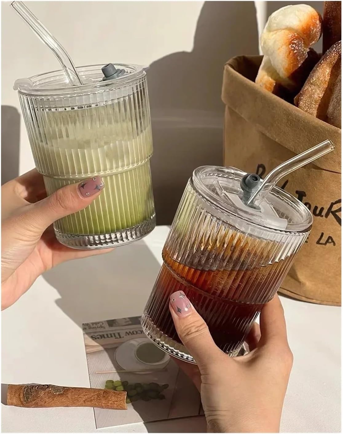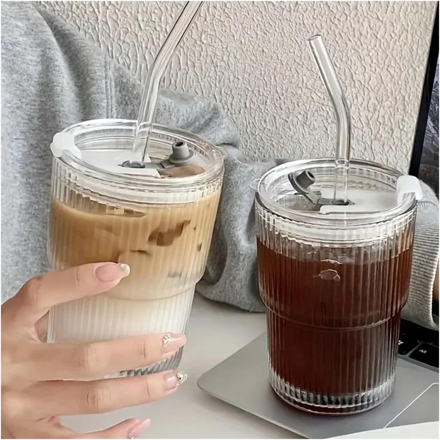 Ribbed Glass Coffee Mug with Straw | Travel Glass Tumbler with Lid