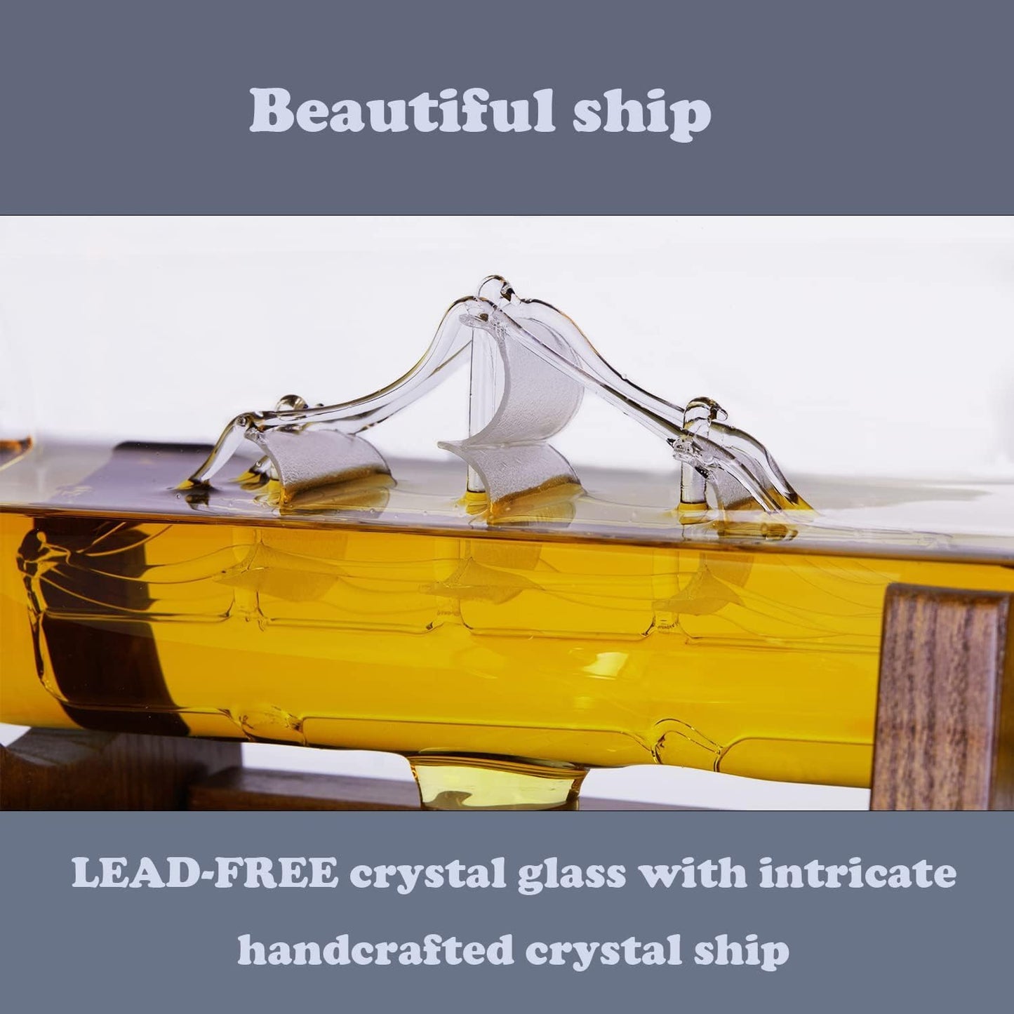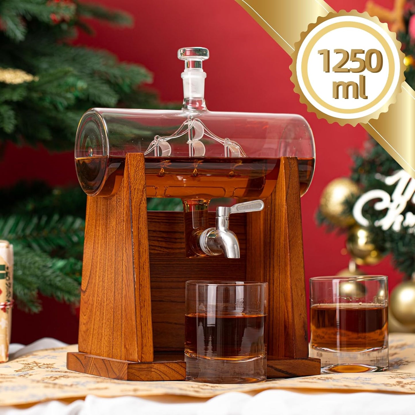 Glass Ship-Inspired Round Decanter with Wooden Stand & 2 Glasses